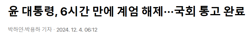 국회의장실 관계자는 이날 기자에게 “계엄 해제를 총리(한덕수 국무총리)로부터 통고받았다”고 밝혔다. 이로써 계엄 해제에 필요한 모든 절차는 완료됐다. (경향)