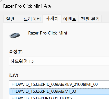 자세히 -> 하드웨어ID (Device Instance Path로 사용)