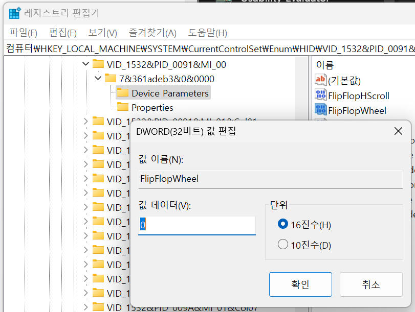 아래 위치의 레지스트리에서 하드웨어 ID로 찾은 이름에 해당하는 Device Instance Path에 맞게 찾아가서,