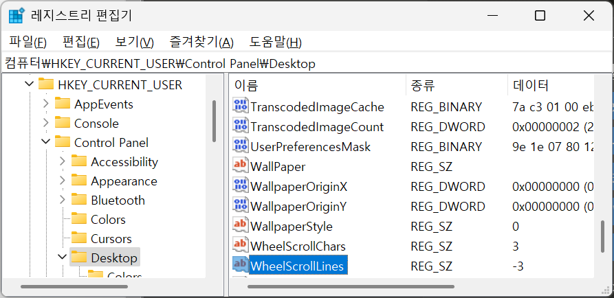 - 오른쪽 창에서 "WheelScrollLines" 값을 찾습니다. 없으면 새로 만듭니다.
