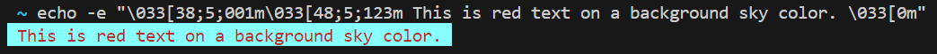 echo -e "\033[38;5;001m\033[48;5;123m This is red text on a background sky color. \033[0m"