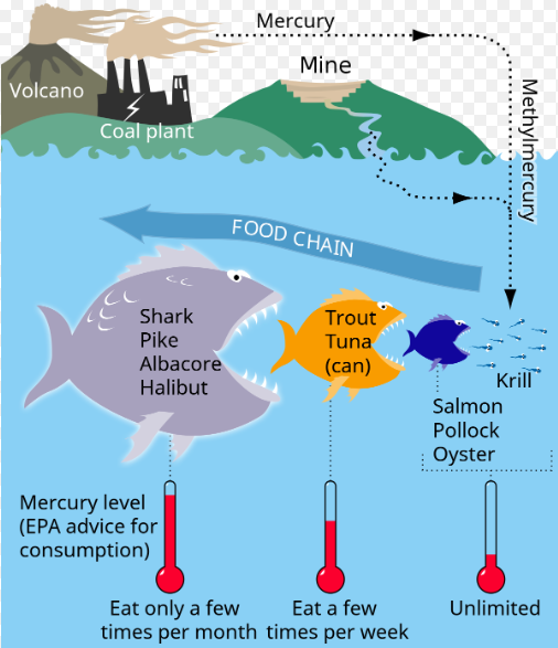 물고기류에서 수은 함량이 0.5 ppm라면, 1kg의 물고기 내에 0.5 mg의 수은이 포함되어 있음을 의미합니다. 수은은 독성이 강하므로 매우 엄격하게 관리되어야 합니다.