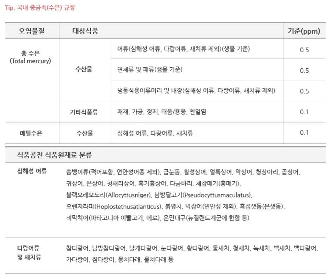 국내 기준에 따르면, 식품 중 수은의 안전한 농도는 다음과 같습니다: