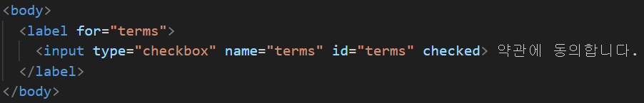 label 요소는 대상 태그의 id를 for 속성으로 지정하여 사용하면, 레이블 클릭 시 해당 태그가 동작하도록 범위를 확장할 수 있습니다. 예를 들어, 체크박스의 레이블을 클릭해도 체크박스가 선택되게 할 수 있습니다.