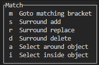 | m | 가까운 둘러싸는 괄호로 이동. | match_brackets |