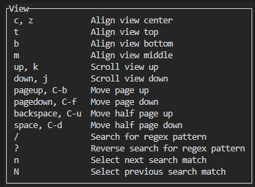 z 하여 뷰 모드로 전환 C-b 하여 ctrl + b 페이지 위로 C-f 하여 ctrl + f 페이지 아래로 C-u 하여 반 페이지 위로 C-d 하여 반 페이지 아래로 |