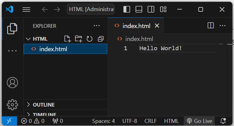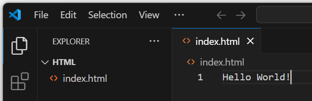 index.html 파일을 선택한 후, 오른쪽 코딩 창에 "Hello World!"를 입력합니다.