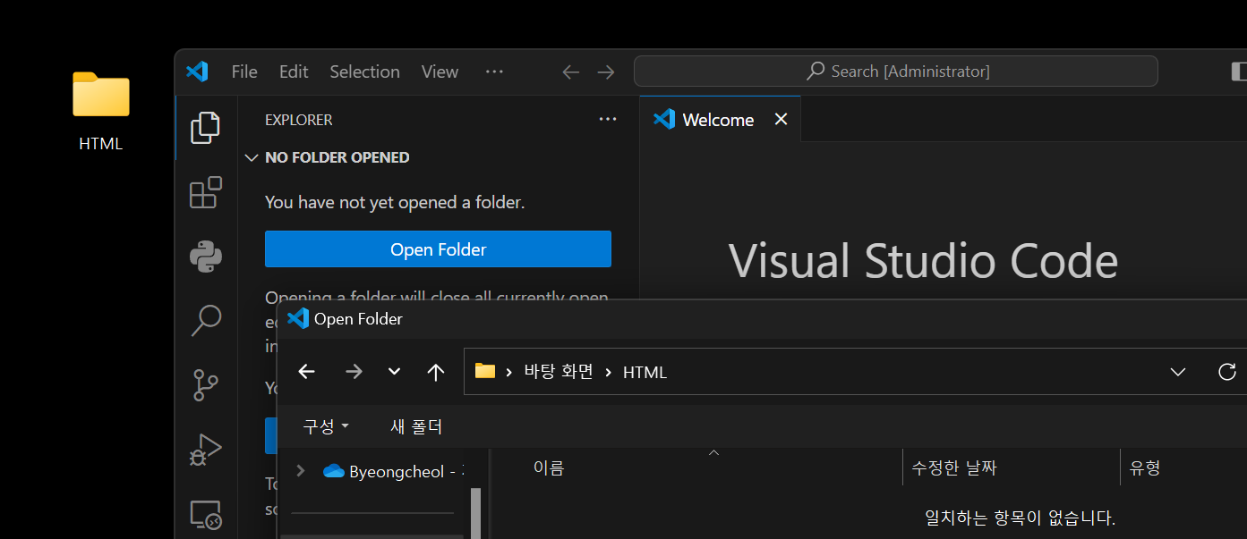 바탕화면에 만든 HTML 폴더를 VSCode에서 'Open Folder' 버튼을 통해 열어줍니다.